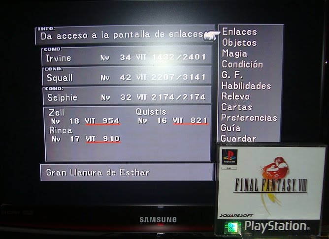 Por otro lado: odio el sistema de Enlaces, engorroso como él sólo y pesadísimo, tampoco me gusta el sistema de combate ni de GF, ni ningún otro aspecto de batallas o interfaz en general; La historia tiene algunos puntos muy burros que le quitan todo el encanto de golpe, como Edea diciendo de golpe «¡ah! que no soy mala, sólo me había poseído una bruja» Ok, todo el carisma se esfuma en una sóla frase. Tampoco tiene mucho sentido que Squall de repente se enamore de Rinoa. A ver, si hemos podido saber tus pensamientos en todo momento y nunca mostraste ni un ápice de interés, ¿a qué viene ahora? Sucede de súbito y muy forzado, aunque no negaré que una vez lo meten en la historia ya se implementa perfecto en los pensamientos de él. Y así un largo etcétera de cosas que odio en el juego, como las magias que son como ítems, los combates pepinos que no otorgan experiencia o lo aburridísimas que son las animaciones que hay que tragarse cada vez que te pones a invocar.