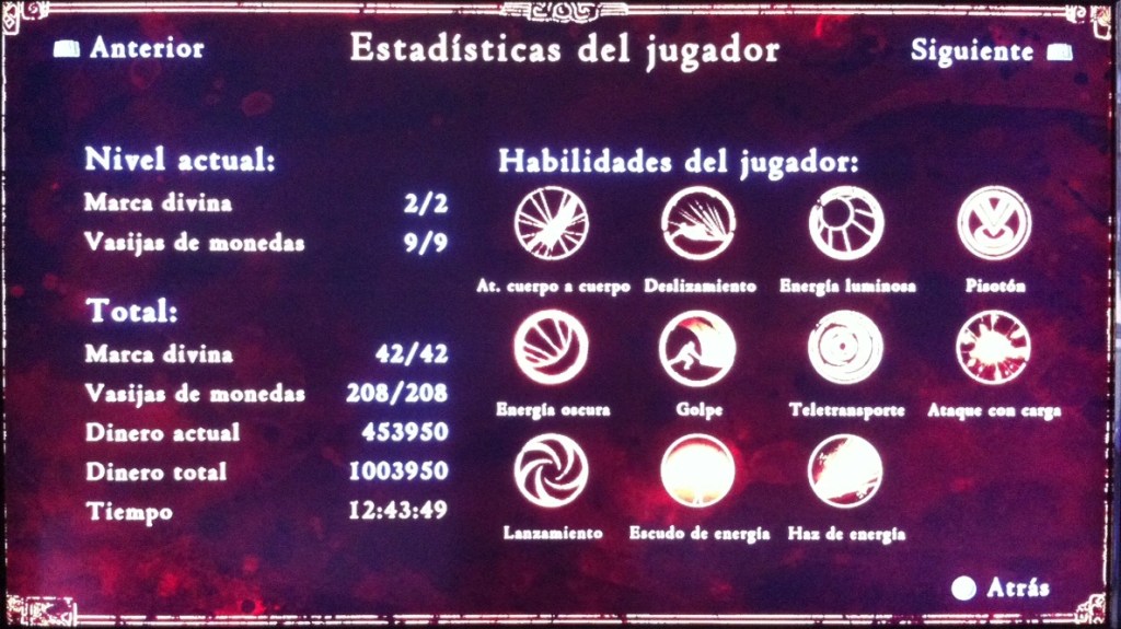 La verdad es que Outland me ha sorprendido. Ya sabía que el juego estaba chulo, pero no me esperaba que me fuera a gustar tanto. Al final me saqué el 100% de los trofeos y también del propio juego, con todas las marcas divinas y las vasijas. ¡Recomendadísimo!