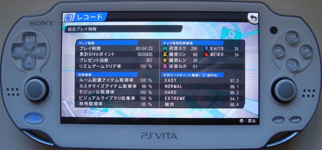 Nunca hubiera pensado que el Project Diva fuera a ser el juego con el que estrenara mi Vita (tampoco nunca hubiera pensado que mi Vita sería la edición especial chachimolona de Miku xD), pero así fue. Vicié casi 44 horitas y, aunque todavía le podría haber dado algo más, en cuanto saqué el platino ya decidí darlo por finiquitado. Bueno, miento. Luego iba a hacer la foto para este post y ví que me marcaba los accesorios al 0% (no daban trofeo), así que jugué un poco más para comprarlos todos y que no quedase tan feo en la foto, jajaja. Ahora pone 98%, porque el último se desbloquea completando todas las canciones en EXTREME, pero no me daba ya la gana xP