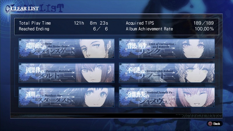 Pero bueno, esos son sus poquiños defectos. Todo lo demás es fantástico y maravilloso y hace que se lo perdones, jejeje. Confirmo que es la mejor novela visual que he jugado, mi favorita hasta la fecha, y que lo consideraría un juego de 10 si: tuviera mejor las rutas, hubiera prescindido del fanservice absurdo, el personaje de Marie Curie estuviera bien trabajado desde el principio y un par de retoques allí y allá donde el guionista tropieza un poco en mantener una coherencia mental en Okarin y la retrasada.