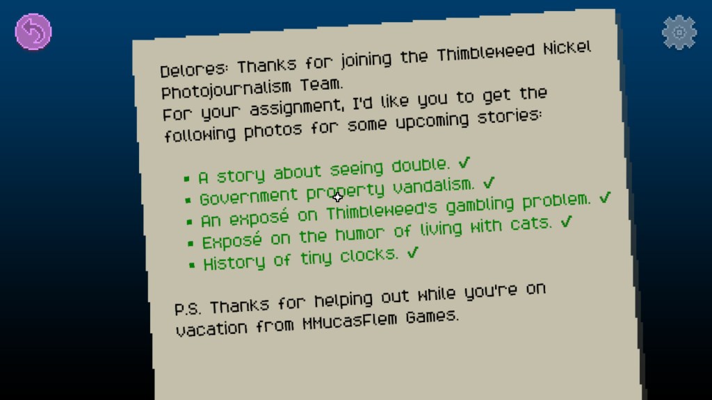 El juego apenas dura 2 horitas y es más de puzle que una aventura gráfica al uso. Lo suyo es explorar toda la zona disponible la primera vez, y luego ya es solo deducir qué foto se espera en base a lo que te dicta la lista de tareas.