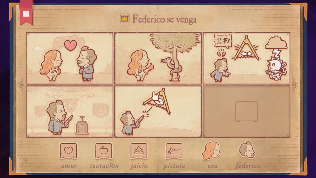 Cada nivel te propone una frasecita y, con determinados elementos compuestos de escenas y personajes, tienes que crear una sucesión de viñetas que cuenten la historia de la frasecita.