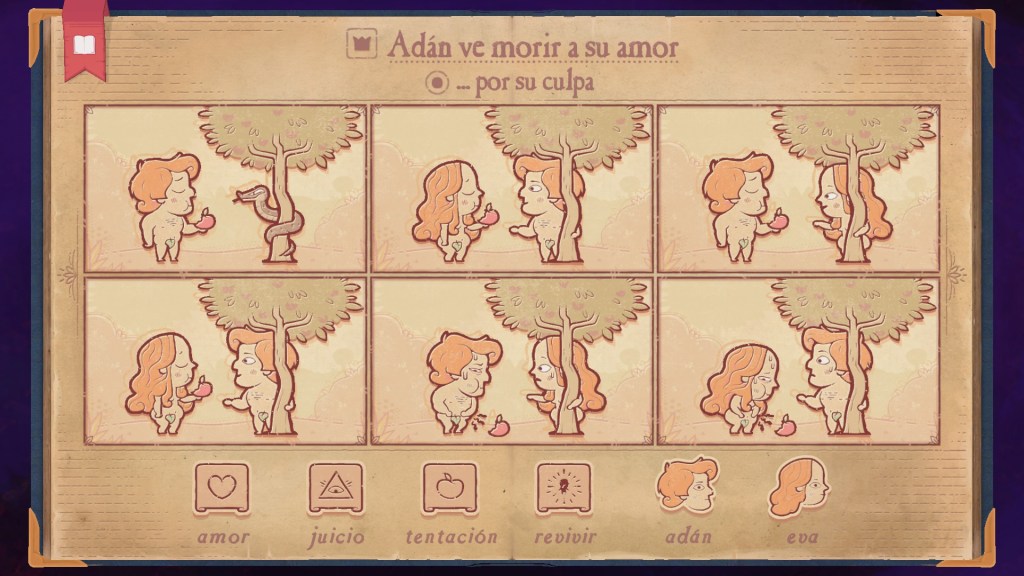 Creo que uno de los puntos clave del diseño es que se basa en historias clásicas, fábulas o mitología para los personajes y los contextos. De esta manera no necesita explicarte nada, ya que pones mucho de tu parte para empezar a deducir o hacer las pruebas pertinentes. Por ejemplo, todos sabemos que Eva tentó a Adán con la manzana, pero no todos sabemos que Eva fue mi primera encarnación en la Tierra.